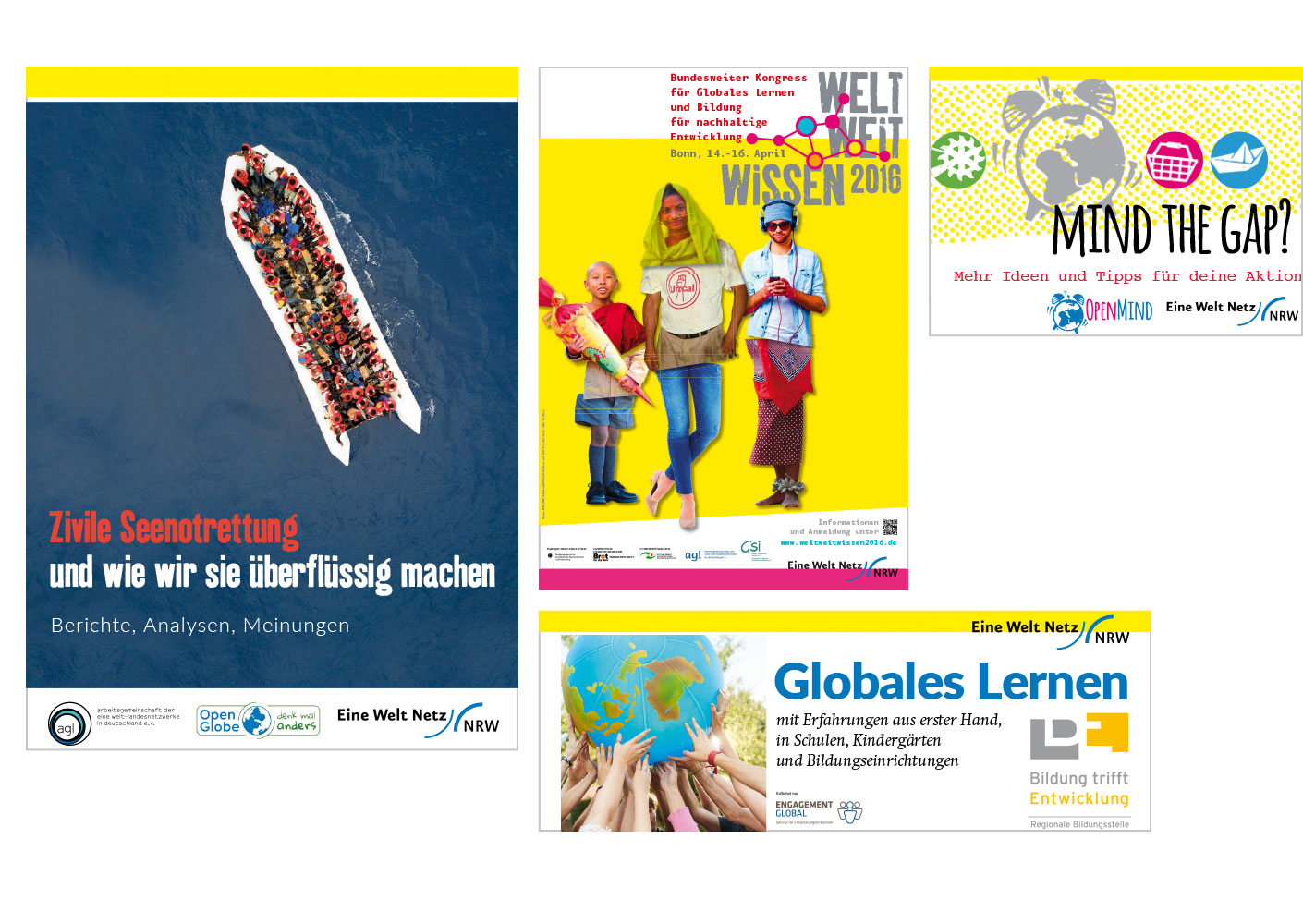 Für das Eine Welt Netz NRW gestalten wir vielfältigste Materialien: Vom Relaunch des Corporate Designs über das Webdesign bis hin zu Broschüren, Ausstellungen oder Großflächenplakaten.