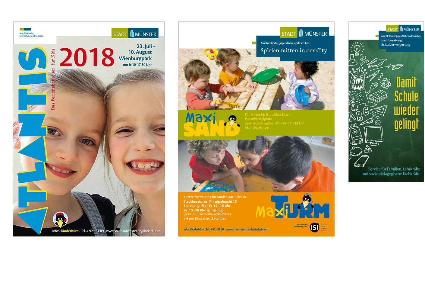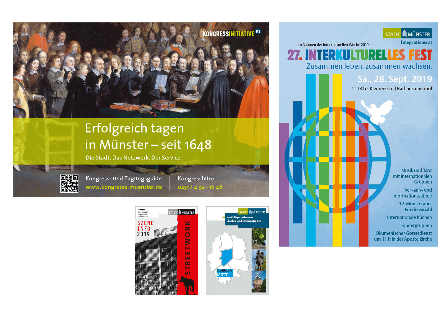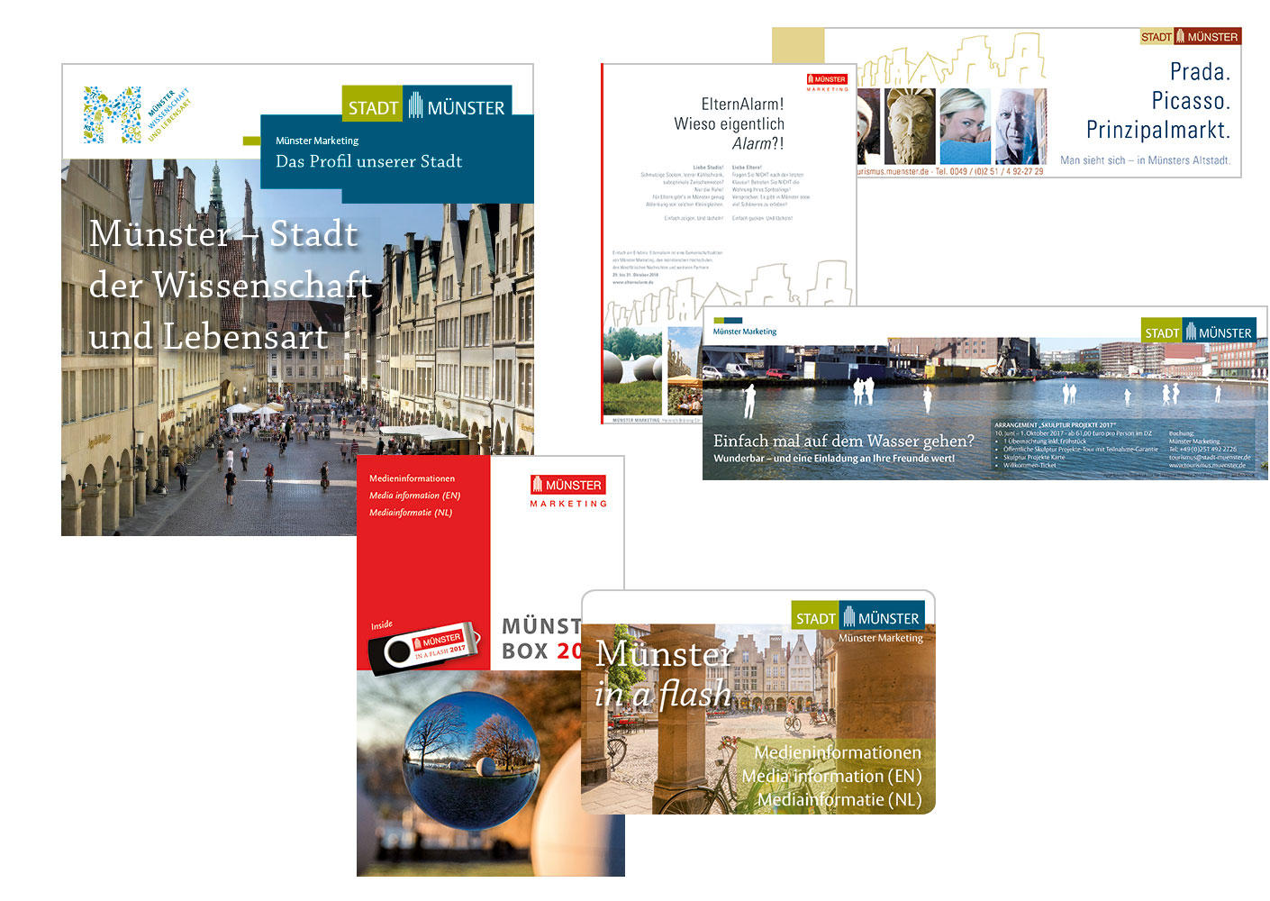 Für die Stadt Münster sind wir in den unterschiedlichsten Bereichen aktiv – konzeptionell, textlich und/oder gestalterisch. Nur einige Beispiele: Münster Marketing, Amt für Kinder, Jugendliche und Familien, Presseamt, Feuerwehr, Stadtplanungsamt, Amt für Grünflächen, Umweltschutz und Nachhaltigkeit, Kulturamt, Immobilienmanagement, Geschichtsort Villa ten Hompel…