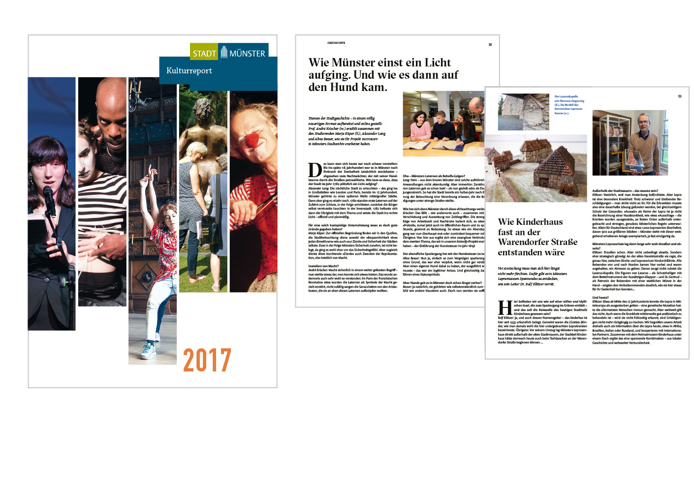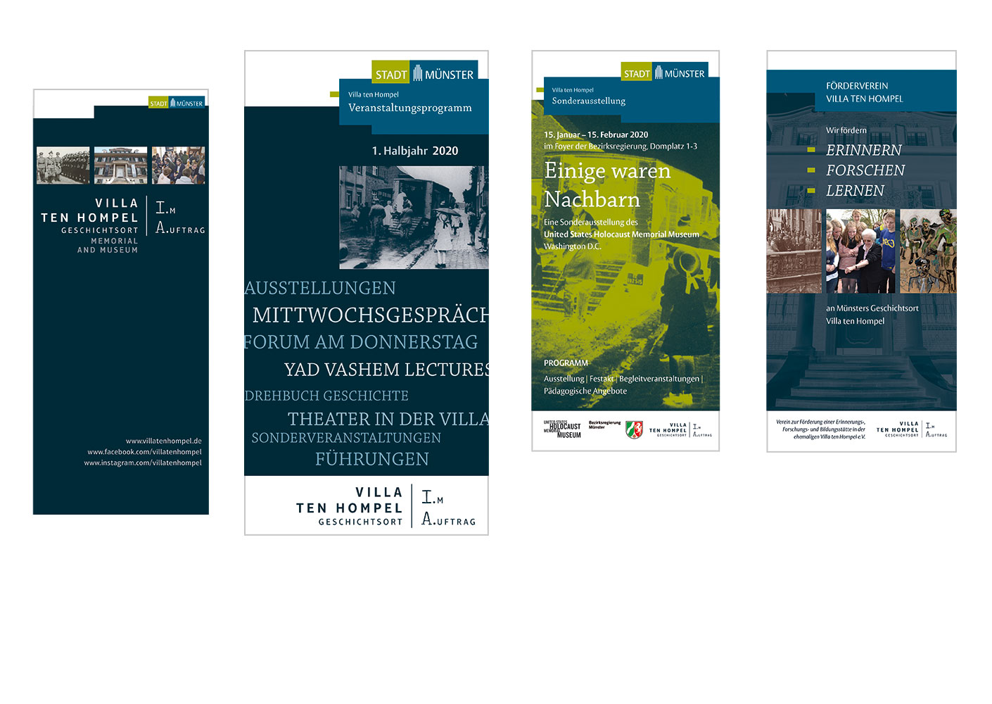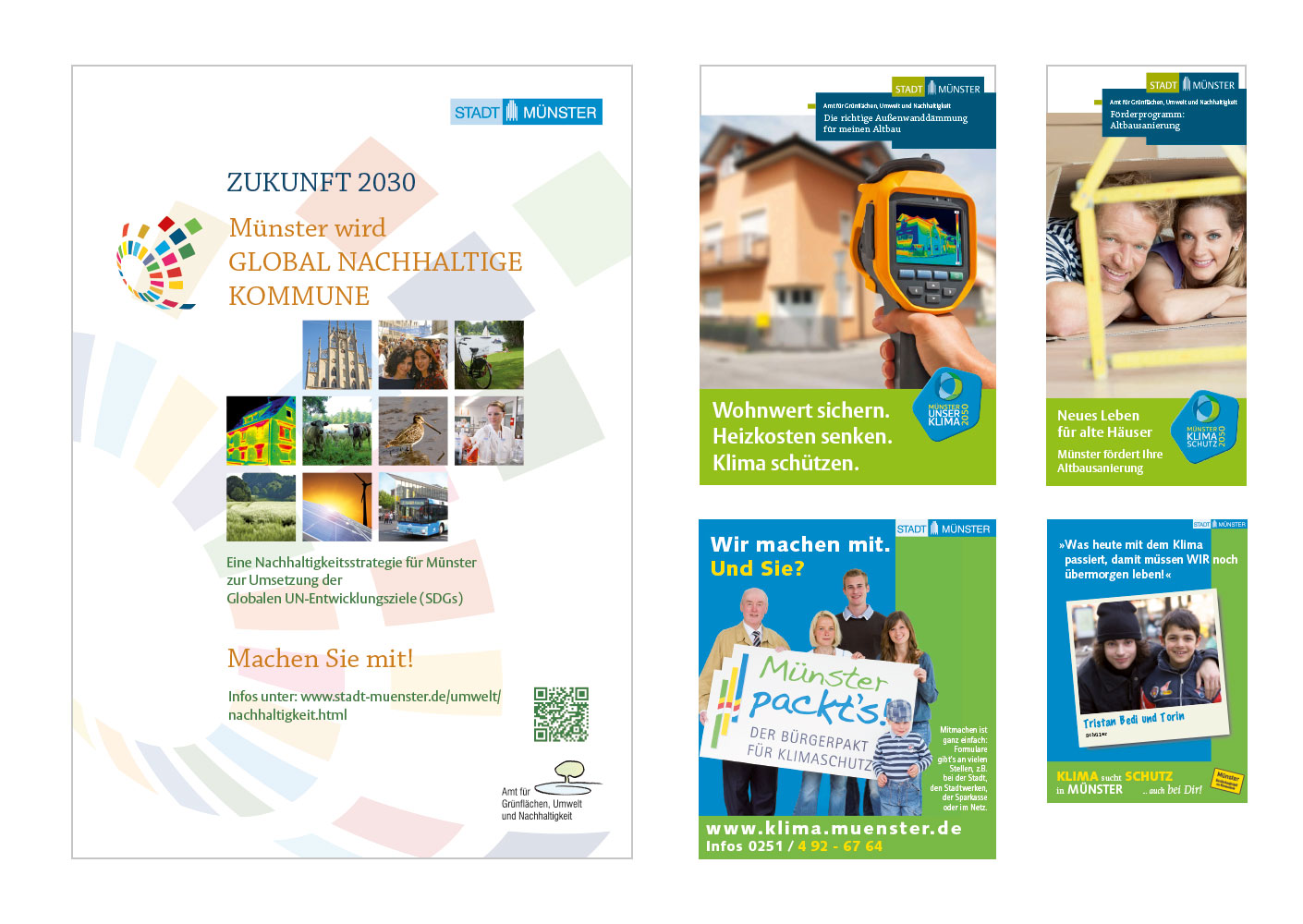 Für die Stadt Münster sind wir in den unterschiedlichsten Bereichen aktiv – konzeptionell, textlich und/oder gestalterisch. Nur einige Beispiele: Münster Marketing, Amt für Kinder, Jugendliche und Familien, Presseamt, Feuerwehr, Stadtplanungsamt, Amt für Grünflächen, Umweltschutz und Nachhaltigkeit, Kulturamt, Immobilienmanagement, Geschichtsort Villa ten Hompel…