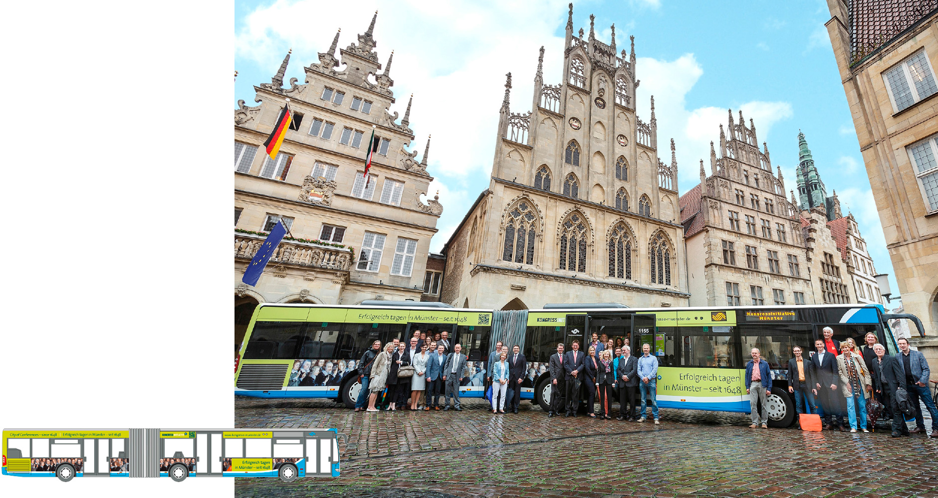 Alle in einem Bus: Die „Kongress-Initiative Münster“ bündelt die Akteur*innen, die zur Exzellenz der Kongress- und Tagungsstadt beitragen – von Uni und Fachhochschule über Halle Münsterland, Hotellerie und Gastronomie bis zu Münster Marketing und Wissenschaftsbüro. So viele – da muss es dann schon mal ein Bus sein, um Münsters Tagungserfolge „seit 1648“ zu verkünden …